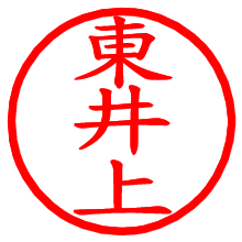 [朱肉の色]を選び、入力窓に“東井上”と入力して[生成]ボタンを押すと、印影が更新され、リンクから電子印鑑(デジタル印影)がダウンロードできます。 電子印鑑「東井上」の作り方文字表示が変なときや、文字バランスが悪いときは[字形切替]のチェックボックスでON/OFFを切り替え[生成]しなおしてください。 生成される画像は通常の印影「東井上.png」と、にじみを表現した少し太めの印影「東井上B.png」の背面透過PNG形式2種と、鮮明なPDF形式の印影「東井上.pdf」の計3種類です。 朱肉の微妙な色の違いを7色で表現しました。デフォルト(左端)は、JISが定めた朱肉の色のマンセル値(7.5R 5/14)をRGB値(217,66,54)に変換したものになっています。 「電子透かし」にチェックを入れて[生成]ボタンを押すと、タイムスタンプを電子透かしとして埋め込んだセキュアな電子印鑑が作れます。詳細は別ページの「タイムスタンプと電子透かし」でご覧ください。 東井上さんの日付印が作れます。「日付スタンプメーカー」は、社内向けの書類に利用されることの多い日付印(データ印)が無料で作れるWebアプリケーションです。中段に日付が入り、上段と下段は、ともに8文字まで文字が入ります。 ![]() 古代文字で落款印が作れます。「落款スタンプメーカー」で作品を引き立たせる落款印が作れます。