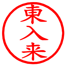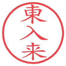 [朱肉の色]を選び、入力窓に“東入来”と入力して[生成]ボタンを押すと、印影が更新され、リンクから電子印鑑(デジタル印影)がダウンロードできます。 電子印鑑「東入来」の作り方文字表示が変なときや、文字バランスが悪いときは[字形切替]のチェックボックスでON/OFFを切り替え[生成]しなおしてください。 生成される画像は通常の印影「東入来.png」と、にじみを表現した少し太めの印影「東入来B.png」の背面透過PNG形式2種と、鮮明なPDF形式の印影「東入来.pdf」の計3種類です。 朱肉の微妙な色の違いを7色で表現しました。デフォルト(左端)は、JISが定めた朱肉の色のマンセル値(7.5R 5/14)をRGB値(217,66,54)に変換したものになっています。 「電子透かし」にチェックを入れて[生成]ボタンを押すと、タイムスタンプを電子透かしとして埋め込んだセキュアな電子印鑑が作れます。詳細は別ページの「タイムスタンプと電子透かし」でご覧ください。 東入来さんの日付印が作れます。「日付スタンプメーカー」は、社内向けの書類に利用されることの多い日付印(データ印)が無料で作れるWebアプリケーションです。中段に日付が入り、上段と下段は、ともに8文字まで文字が入ります。 ![]() 古代文字で落款印が作れます。「落款スタンプメーカー」で作品を引き立たせる落款印が作れます。