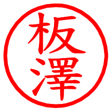 [朱肉の色]を選び、入力窓に“板澤”と入力して[生成]ボタンを押すと、印影が更新され、リンクから電子印鑑(デジタル印影)がダウンロードできます。 電子印鑑「板澤」の作り方文字表示が変なときや、文字バランスが悪いときは[字形切替]のチェックボックスでON/OFFを切り替え[生成]しなおしてください。 生成される画像は通常の印影「板澤.png」と、にじみを表現した少し太めの印影「板澤B.png」の背面透過PNG形式2種と、鮮明なPDF形式の印影「板澤.pdf」の計3種類です。 朱肉の微妙な色の違いを7色で表現しました。デフォルト(左端)は、JISが定めた朱肉の色のマンセル値(7.5R 5/14)をRGB値(217,66,54)に変換したものになっています。 「電子透かし」にチェックを入れて[生成]ボタンを押すと、タイムスタンプを透かしとして埋め込んだセキュアな電子印鑑が作れます。詳細は別ページの「電子透かしとタイムスタンプ」でご覧ください。  板澤さんの日付印が作れます。「日付スタンプメーカー」は、社内向けの書類に利用されることの多い日付印(データ印)が無料で作れるWebアプリケーションです。中段に日付が入り、上段と下段は、ともに8文字まで文字が入ります。 ![]()  古代文字で落款印が作れます。「落款スタンプメーカー」で作品を引き立たせる落款印が作れます。