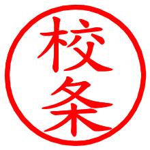 [朱肉の色]を選び、入力窓に“校条”と入力して[生成]ボタンを押すと、印影が更新され、リンクから電子印鑑(デジタル印影)がダウンロードできます。 電子印鑑「校条」の作り方文字表示が変なときや、文字バランスが悪いときは[字形切替]のチェックボックスでON/OFFを切り替え[生成]しなおしてください。 生成される画像は通常の印影「校条.png」と、にじみを表現した少し太めの印影「校条B.png」の背面透過PNG形式2種と、鮮明なPDF形式の印影「校条.pdf」の計3種類です。 朱肉の微妙な色の違いを7色で表現しました。デフォルト(左端)は、JISが定めた朱肉の色のマンセル値(7.5R 5/14)をRGB値(217,66,54)に変換したものになっています。 「電子透かし」にチェックを入れて[生成]ボタンを押すと、タイムスタンプを電子透かしとして埋め込んだセキュアな電子印鑑が作れます。詳細は別ページの「タイムスタンプと電子透かし」でご覧ください。 校条さんの日付印が作れます。「日付スタンプメーカー」は、社内向けの書類に利用されることの多い日付印(データ印)が無料で作れるWebアプリケーションです。中段に日付が入り、上段と下段は、ともに8文字まで文字が入ります。 ![]() 古代文字で落款印が作れます。「落款スタンプメーカー」で作品を引き立たせる落款印が作れます。