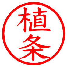 [朱肉の色]を選び、入力窓に“植条”と入力して[生成]ボタンを押すと、印影が更新され、リンクから電子印鑑(デジタル印影)がダウンロードできます。 電子印鑑「植条」の作り方文字表示が変なときや、文字バランスが悪いときは[字形切替]のチェックボックスでON/OFFを切り替え[生成]しなおしてください。 生成される画像は通常の印影「植条.png」と、にじみを表現した少し太めの印影「植条B.png」の背面透過PNG形式2種と、鮮明なPDF形式の印影「植条.pdf」の計3種類です。 朱肉の微妙な色の違いを7色で表現しました。デフォルト(左端)は、JISが定めた朱肉の色のマンセル値(7.5R 5/14)をRGB値(217,66,54)に変換したものになっています。 「電子透かし」にチェックを入れて[生成]ボタンを押すと、タイムスタンプを電子透かしとして埋め込んだセキュアな電子印鑑が作れます。詳細は別ページの「タイムスタンプと電子透かし」でご覧ください。 植条さんの日付印が作れます。「日付スタンプメーカー」は、社内向けの書類に利用されることの多い日付印(データ印)が無料で作れるWebアプリケーションです。中段に日付が入り、上段と下段は、ともに8文字まで文字が入ります。 ![]() 古代文字で落款印が作れます。「落款スタンプメーカー」で作品を引き立たせる落款印が作れます。