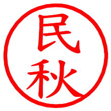 [朱肉の色]を選び、入力窓に“民秋”と入力して[生成]ボタンを押すと、印影が更新され、リンクから電子印鑑(デジタル印影)がダウンロードできます。 電子印鑑「民秋」の作り方文字表示が変なときや、文字バランスが悪いときは[字形切替]のチェックボックスでON/OFFを切り替え[生成]しなおしてください。 生成される画像は通常の印影「民秋.png」と、にじみを表現した少し太めの印影「民秋B.png」の背面透過PNG形式2種と、鮮明なPDF形式の印影「民秋.pdf」の計3種類です。 朱肉の微妙な色の違いを7色で表現しました。デフォルト(左端)は、JISが定めた朱肉の色のマンセル値(7.5R 5/14)をRGB値(217,66,54)に変換したものになっています。 「電子透かし」にチェックを入れて[生成]ボタンを押すと、タイムスタンプを電子透かしとして埋め込んだセキュアな電子印鑑が作れます。詳細は別ページの「タイムスタンプと電子透かし」でご覧ください。 民秋さんの日付印が作れます。「日付スタンプメーカー」は、社内向けの書類に利用されることの多い日付印(データ印)が無料で作れるWebアプリケーションです。中段に日付が入り、上段と下段は、ともに8文字まで文字が入ります。 ![]() 古代文字で落款印が作れます。「落款スタンプメーカー」で作品を引き立たせる落款印が作れます。