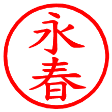 [朱肉の色]を選び、入力窓に“永春”と入力して[生成]ボタンを押すと、印影が更新され、リンクから電子印鑑(デジタル印影)がダウンロードできます。 電子印鑑「永春」の作り方文字表示が変なときや、文字バランスが悪いときは[字形切替]のチェックボックスでON/OFFを切り替え[生成]しなおしてください。 生成される画像は通常の印影「永春.png」と、にじみを表現した少し太めの印影「永春B.png」の背面透過PNG形式2種と、鮮明なPDF形式の印影「永春.pdf」の計3種類です。 朱肉の微妙な色の違いを7色で表現しました。デフォルト(左端)は、JISが定めた朱肉の色のマンセル値(7.5R 5/14)をRGB値(217,66,54)に変換したものになっています。 「電子透かし」にチェックを入れて[生成]ボタンを押すと、タイムスタンプを透かしとして埋め込んだセキュアな電子印鑑が作れます。詳細は別ページの「電子透かしとタイムスタンプ」でご覧ください。  永春さんの日付印が作れます。「日付スタンプメーカー」は、社内向けの書類に利用されることの多い日付印(データ印)が無料で作れるWebアプリケーションです。 中段に日付が入り、上段と下段は、ともに8文字まで文字が入ります。   古代文字で落款印が作れます。「落款スタンプメーカー」で作品を引き立たせる落款印が作れます。  なりきり書道 「落款スタンプメーカー」で作成した落款印の全体的な配置バランスの確認にご利用いただけます。デザインのワンポイントやラインスタンプ等にもお使いください。  遊び心ある永春さんの角印はいかが? 絵文字が使えてLINEスタンプや年賀状にも使える消しゴムはんこ風の電子印鑑が作れます。  画像スタンプメーカーは、猫派の方はもちろん。犬派の方にもおすすめしたいペットなどのお気に入りの画像とかわいいタッチの文字が入るほっこりしたスタンプです。 マイスタンプメーカーとは法的な電子印鑑にはあたりませんので三文判的な位置付けでご利用ください。 | ||