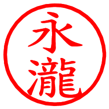 [朱肉の色]を選び、入力窓に“永瀧”と入力して[生成]ボタンを押すと、印影が更新され、リンクから電子印鑑(デジタル印影)がダウンロードできます。 電子印鑑「永瀧」の作り方文字表示が変なときや、文字バランスが悪いときは[字形切替]のチェックボックスでON/OFFを切り替え[生成]しなおしてください。 生成される画像は通常の印影「永瀧.png」と、にじみを表現した少し太めの印影「永瀧B.png」の背面透過PNG形式2種と、鮮明なPDF形式の印影「永瀧.pdf」の計3種類です。 朱肉の微妙な色の違いを7色で表現しました。デフォルト(左端)は、JISが定めた朱肉の色のマンセル値(7.5R 5/14)をRGB値(217,66,54)に変換したものになっています。 「電子透かし」にチェックを入れて[生成]ボタンを押すと、タイムスタンプを電子透かしとして埋め込んだセキュアな電子印鑑が作れます。詳細は別ページの「タイムスタンプと電子透かし」でご覧ください。 永瀧さんの日付印が作れます。「日付スタンプメーカー」は、社内向けの書類に利用されることの多い日付印(データ印)が無料で作れるWebアプリケーションです。中段に日付が入り、上段と下段は、ともに8文字まで文字が入ります。 ![]() 古代文字で落款印が作れます。「落款スタンプメーカー」で作品を引き立たせる落款印が作れます。