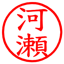 [朱肉の色]を選び、入力窓に“河瀬”と入力して[生成]ボタンを押すと、印影が更新され、リンクから電子印鑑(デジタル印影)がダウンロードできます。 電子印鑑「河瀬」の作り方文字表示が変なときや、文字バランスが悪いときは[字形切替]のチェックボックスでON/OFFを切り替え[生成]しなおしてください。 生成される画像は通常の印影「河瀬.png」と、にじみを表現した少し太めの印影「河瀬B.png」の背面透過PNG形式2種と、鮮明なPDF形式の印影「河瀬.pdf」の計3種類です。 朱肉の微妙な色の違いを7色で表現しました。デフォルト(左端)は、JISが定めた朱肉の色のマンセル値(7.5R 5/14)をRGB値(217,66,54)に変換したものになっています。 「電子透かし」にチェックを入れて[生成]ボタンを押すと、タイムスタンプを透かしとして埋め込んだセキュアな電子印鑑が作れます。詳細は別ページの「電子透かしとタイムスタンプ」でご覧ください。 河瀬さんの日付印が作れます。「日付スタンプメーカー」は、社内向けの書類に利用されることの多い日付印(データ印)が無料で作れるWebアプリケーションです。中段に日付が入り、上段と下段は、ともに8文字まで文字が入ります。 ![]() 古代文字で落款印が作れます。「落款スタンプメーカー」で作品を引き立たせる落款印が作れます。