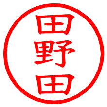 [朱肉の色]を選び、入力窓に“田野田”と入力して[生成]ボタンを押すと、印影が更新され、リンクから電子印鑑(デジタル印影)がダウンロードできます。 電子印鑑「田野田」の作り方文字表示が変なときや、文字バランスが悪いときは[字形切替]のチェックボックスでON/OFFを切り替え[生成]しなおしてください。 生成される画像は通常の印影「田野田.png」と、にじみを表現した少し太めの印影「田野田B.png」の背面透過PNG形式2種と、鮮明なPDF形式の印影「田野田.pdf」の計3種類です。 朱肉の微妙な色の違いを7色で表現しました。デフォルト(左端)は、JISが定めた朱肉の色のマンセル値(7.5R 5/14)をRGB値(217,66,54)に変換したものになっています。 「電子透かし」にチェックを入れて[生成]ボタンを押すと、タイムスタンプを電子透かしとして埋め込んだセキュアな電子印鑑が作れます。詳細は別ページの「タイムスタンプと電子透かし」でご覧ください。 田野田さんの日付印が作れます。「日付スタンプメーカー」は、社内向けの書類に利用されることの多い日付印(データ印)が無料で作れるWebアプリケーションです。中段に日付が入り、上段と下段は、ともに8文字まで文字が入ります。 ![]() 古代文字で落款印が作れます。「落款スタンプメーカー」で作品を引き立たせる落款印が作れます。