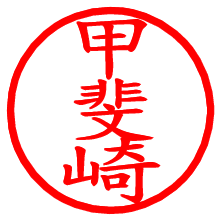 [朱肉の色]を選び、入力窓に“甲斐崎”と入力して[生成]ボタンを押すと、印影が更新され、リンクから電子印鑑(デジタル印影)がダウンロードできます。 電子印鑑「甲斐崎」の作り方文字表示が変なときや、文字バランスが悪いときは[字形切替]のチェックボックスでON/OFFを切り替え[生成]しなおしてください。 生成される画像は通常の印影「甲斐崎.png」と、にじみを表現した少し太めの印影「甲斐崎B.png」の背面透過PNG形式2種と、鮮明なPDF形式の印影「甲斐崎.pdf」の計3種類です。 朱肉の微妙な色の違いを7色で表現しました。デフォルト(左端)は、JISが定めた朱肉の色のマンセル値(7.5R 5/14)をRGB値(217,66,54)に変換したものになっています。 「電子透かし」にチェックを入れて[生成]ボタンを押すと、タイムスタンプを透かしとして埋め込んだセキュアな電子印鑑が作れます。詳細は別ページの「電子透かしとタイムスタンプ」でご覧ください。 甲斐崎さんの日付印が作れます。「日付スタンプメーカー」は、社内向けの書類に利用されることの多い日付印(データ印)が無料で作れるWebアプリケーションです。中段に日付が入り、上段と下段は、ともに8文字まで文字が入ります。 ![]() 古代文字で落款印が作れます。「落款スタンプメーカー」で作品を引き立たせる落款印が作れます。