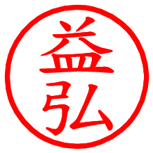 [朱肉の色]を選び、入力窓に“益弘”と入力して[生成]ボタンを押すと、印影が更新され、リンクから電子印鑑(デジタル印影)がダウンロードできます。 電子印鑑「益弘」の作り方文字表示が変なときや、文字バランスが悪いときは[字形切替]のチェックボックスでON/OFFを切り替え[生成]しなおしてください。 生成される画像は通常の印影「益弘.png」と、にじみを表現した少し太めの印影「益弘B.png」の背面透過PNG形式2種と、鮮明なPDF形式の印影「益弘.pdf」の計3種類です。 朱肉の微妙な色の違いを7色で表現しました。デフォルト(左端)は、JISが定めた朱肉の色のマンセル値(7.5R 5/14)をRGB値(217,66,54)に変換したものになっています。 「電子透かし」にチェックを入れて[生成]ボタンを押すと、タイムスタンプを電子透かしとして埋め込んだセキュアな電子印鑑が作れます。詳細は別ページの「タイムスタンプと電子透かし」でご覧ください。 益弘さんの日付印が作れます。「日付スタンプメーカー」は、社内向けの書類に利用されることの多い日付印(データ印)が無料で作れるWebアプリケーションです。中段に日付が入り、上段と下段は、ともに8文字まで文字が入ります。 ![]() 古代文字で落款印が作れます。「落款スタンプメーカー」で作品を引き立たせる落款印が作れます。