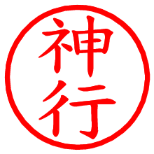 [朱肉の色]を選び、入力窓に“神行”と入力して[生成]ボタンを押すと、印影が更新され、リンクから電子印鑑(デジタル印影)がダウンロードできます。 電子印鑑「神行」の作り方文字表示が変なときや、文字バランスが悪いときは[字形切替]のチェックボックスでON/OFFを切り替え[生成]しなおしてください。 生成される画像は通常の印影「神行.png」と、にじみを表現した少し太めの印影「神行B.png」の背面透過PNG形式2種と、鮮明なPDF形式の印影「神行.pdf」の計3種類です。 朱肉の微妙な色の違いを7色で表現しました。デフォルト(左端)は、JISが定めた朱肉の色のマンセル値(7.5R 5/14)をRGB値(217,66,54)に変換したものになっています。 「電子透かし」にチェックを入れて[生成]ボタンを押すと、タイムスタンプを電子透かしとして埋め込んだセキュアな電子印鑑が作れます。詳細は別ページの「タイムスタンプと電子透かし」でご覧ください。 神行さんの日付印が作れます。「日付スタンプメーカー」は、社内向けの書類に利用されることの多い日付印(データ印)が無料で作れるWebアプリケーションです。中段に日付が入り、上段と下段は、ともに8文字まで文字が入ります。 ![]() 古代文字で落款印が作れます。「落款スタンプメーカー」で作品を引き立たせる落款印が作れます。