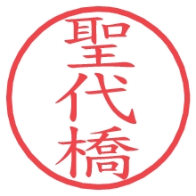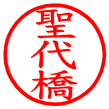 [朱肉の色]を選び、入力窓に“聖代橋”と入力して[生成]ボタンを押すと、印影が更新され、リンクから電子印鑑(デジタル印影)がダウンロードできます。 電子印鑑「聖代橋」の作り方文字表示が変なときや、文字バランスが悪いときは[字形切替]のチェックボックスでON/OFFを切り替え[生成]しなおしてください。 生成される画像は通常の印影「聖代橋.png」と、にじみを表現した少し太めの印影「聖代橋B.png」の背面透過PNG形式2種と、鮮明なPDF形式の印影「聖代橋.pdf」の計3種類です。 朱肉の微妙な色の違いを7色で表現しました。デフォルト(左端)は、JISが定めた朱肉の色のマンセル値(7.5R 5/14)をRGB値(217,66,54)に変換したものになっています。 「電子透かし」にチェックを入れて[生成]ボタンを押すと、タイムスタンプを電子透かしとして埋め込んだセキュアな電子印鑑が作れます。詳細は別ページの「タイムスタンプと電子透かし」でご覧ください。 聖代橋さんの日付印が作れます。「日付スタンプメーカー」は、社内向けの書類に利用されることの多い日付印(データ印)が無料で作れるWebアプリケーションです。中段に日付が入り、上段と下段は、ともに8文字まで文字が入ります。 ![]() 古代文字で落款印が作れます。「落款スタンプメーカー」で作品を引き立たせる落款印が作れます。