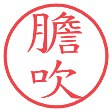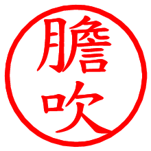 [朱肉の色]を選び、入力窓に“膽吹”と入力して[生成]ボタンを押すと、印影が更新され、リンクから電子印鑑(デジタル印影)がダウンロードできます。 電子印鑑「膽吹」の作り方文字表示が変なときや、文字バランスが悪いときは[字形切替]のチェックボックスでON/OFFを切り替え[生成]しなおしてください。 生成される画像は通常の印影「膽吹.png」と、にじみを表現した少し太めの印影「膽吹B.png」の背面透過PNG形式2種と、鮮明なPDF形式の印影「膽吹.pdf」の計3種類です。 朱肉の微妙な色の違いを7色で表現しました。デフォルト(左端)は、JISが定めた朱肉の色のマンセル値(7.5R 5/14)をRGB値(217,66,54)に変換したものになっています。 「電子透かし」にチェックを入れて[生成]ボタンを押すと、タイムスタンプを電子透かしとして埋め込んだセキュアな電子印鑑が作れます。詳細は別ページの「タイムスタンプと電子透かし」でご覧ください。 膽吹さんの日付印が作れます。「日付スタンプメーカー」は、社内向けの書類に利用されることの多い日付印(データ印)が無料で作れるWebアプリケーションです。中段に日付が入り、上段と下段は、ともに8文字まで文字が入ります。 ![]() 古代文字で落款印が作れます。「落款スタンプメーカー」で作品を引き立たせる落款印が作れます。