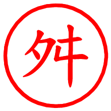 [朱肉の色]を選び、入力窓に“舛”と入力して[生成]ボタンを押すと、印影が更新され、リンクから電子印鑑(デジタル印影)がダウンロードできます。 電子印鑑「舛」の作り方文字表示が変なときや、文字バランスが悪いときは[字形切替]のチェックボックスでON/OFFを切り替え[生成]しなおしてください。 生成される画像は通常の印影「舛.png」と、にじみを表現した少し太めの印影「舛B.png」の背面透過PNG形式2種と、鮮明なPDF形式の印影「舛.pdf」の計3種類です。 朱肉の微妙な色の違いを7色で表現しました。デフォルト(左端)は、JISが定めた朱肉の色のマンセル値(7.5R 5/14)をRGB値(217,66,54)に変換したものになっています。 「電子透かし」にチェックを入れて[生成]ボタンを押すと、タイムスタンプを電子透かしとして埋め込んだセキュアな電子印鑑が作れます。詳細は別ページの「タイムスタンプと電子透かし」でご覧ください。 舛さんの日付印が作れます。「日付スタンプメーカー」は、社内向けの書類に利用されることの多い日付印(データ印)が無料で作れるWebアプリケーションです。中段に日付が入り、上段と下段は、ともに8文字まで文字が入ります。 ![]() 古代文字で落款印が作れます。「落款スタンプメーカー」で作品を引き立たせる落款印が作れます。