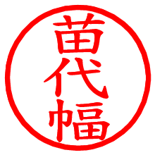 [朱肉の色]を選び、入力窓に“苗代幅”と入力して[生成]ボタンを押すと、印影が更新され、リンクから電子印鑑(デジタル印影)がダウンロードできます。 電子印鑑「苗代幅」の作り方文字表示が変なときや、文字バランスが悪いときは[字形切替]のチェックボックスでON/OFFを切り替え[生成]しなおしてください。 生成される画像は通常の印影「苗代幅.png」と、にじみを表現した少し太めの印影「苗代幅B.png」の背面透過PNG形式2種と、鮮明なPDF形式の印影「苗代幅.pdf」の計3種類です。 朱肉の微妙な色の違いを7色で表現しました。デフォルト(左端)は、JISが定めた朱肉の色のマンセル値(7.5R 5/14)をRGB値(217,66,54)に変換したものになっています。 「電子透かし」にチェックを入れて[生成]ボタンを押すと、タイムスタンプを電子透かしとして埋め込んだセキュアな電子印鑑が作れます。詳細は別ページの「タイムスタンプと電子透かし」でご覧ください。 苗代幅さんの日付印が作れます。「日付スタンプメーカー」は、社内向けの書類に利用されることの多い日付印(データ印)が無料で作れるWebアプリケーションです。中段に日付が入り、上段と下段は、ともに8文字まで文字が入ります。 ![]() 古代文字で落款印が作れます。「落款スタンプメーカー」で作品を引き立たせる落款印が作れます。