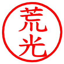 [朱肉の色]を選び、入力窓に“荒光”と入力して[生成]ボタンを押すと、印影が更新され、リンクから電子印鑑(デジタル印影)がダウンロードできます。 電子印鑑「荒光」の作り方文字表示が変なときや、文字バランスが悪いときは[字形切替]のチェックボックスでON/OFFを切り替え[生成]しなおしてください。 生成される画像は通常の印影「荒光.png」と、にじみを表現した少し太めの印影「荒光B.png」の背面透過PNG形式2種と、鮮明なPDF形式の印影「荒光.pdf」の計3種類です。 朱肉の微妙な色の違いを7色で表現しました。デフォルト(左端)は、JISが定めた朱肉の色のマンセル値(7.5R 5/14)をRGB値(217,66,54)に変換したものになっています。 「電子透かし」にチェックを入れて[生成]ボタンを押すと、タイムスタンプを透かしとして埋め込んだセキュアな電子印鑑が作れます。詳細は別ページの「電子透かしとタイムスタンプ」でご覧ください。  荒光さんの日付印が作れます。「日付スタンプメーカー」は、社内向けの書類に利用されることの多い日付印(データ印)が無料で作れるWebアプリケーションです。中段に日付が入り、上段と下段は、ともに8文字まで文字が入ります。 ![]()  古代文字で落款印が作れます。「落款スタンプメーカー」で作品を引き立たせる落款印が作れます。