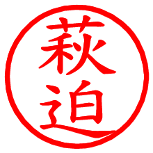 [朱肉の色]を選び、入力窓に“萩迫”と入力して[生成]ボタンを押すと、印影が更新され、リンクから電子印鑑(デジタル印影)がダウンロードできます。 電子印鑑「萩迫」の作り方文字表示が変なときや、文字バランスが悪いときは[字形切替]のチェックボックスでON/OFFを切り替え[生成]しなおしてください。 生成される画像は通常の印影「萩迫.png」と、にじみを表現した少し太めの印影「萩迫B.png」の背面透過PNG形式2種と、鮮明なPDF形式の印影「萩迫.pdf」の計3種類です。 朱肉の微妙な色の違いを7色で表現しました。デフォルト(左端)は、JISが定めた朱肉の色のマンセル値(7.5R 5/14)をRGB値(217,66,54)に変換したものになっています。 「電子透かし」にチェックを入れて[生成]ボタンを押すと、タイムスタンプを電子透かしとして埋め込んだセキュアな電子印鑑が作れます。詳細は別ページの「タイムスタンプと電子透かし」でご覧ください。 萩迫さんの日付印が作れます。「日付スタンプメーカー」は、社内向けの書類に利用されることの多い日付印(データ印)が無料で作れるWebアプリケーションです。中段に日付が入り、上段と下段は、ともに8文字まで文字が入ります。 ![]() 古代文字で落款印が作れます。「落款スタンプメーカー」で作品を引き立たせる落款印が作れます。