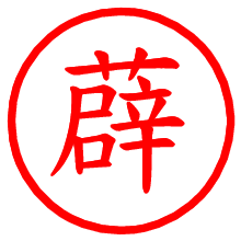 [朱肉の色]を選び、入力窓に“薜”と入力して[生成]ボタンを押すと、印影が更新され、リンクから電子印鑑(デジタル印影)がダウンロードできます。 電子印鑑「薜」の作り方文字表示が変なときや、文字バランスが悪いときは[字形切替]のチェックボックスでON/OFFを切り替え[生成]しなおしてください。 生成される画像は通常の印影「薜.png」と、にじみを表現した少し太めの印影「薜B.png」の背面透過PNG形式2種と、鮮明なPDF形式の印影「薜.pdf」の計3種類です。 朱肉の微妙な色の違いを7色で表現しました。デフォルト(左端)は、JISが定めた朱肉の色のマンセル値(7.5R 5/14)をRGB値(217,66,54)に変換したものになっています。 「電子透かし」にチェックを入れて[生成]ボタンを押すと、タイムスタンプを電子透かしとして埋め込んだセキュアな電子印鑑が作れます。詳細は別ページの「タイムスタンプと電子透かし」でご覧ください。 薜さんの日付印が作れます。「日付スタンプメーカー」は、社内向けの書類に利用されることの多い日付印(データ印)が無料で作れるWebアプリケーションです。中段に日付が入り、上段と下段は、ともに8文字まで文字が入ります。 ![]() 古代文字で落款印が作れます。「落款スタンプメーカー」で作品を引き立たせる落款印が作れます。