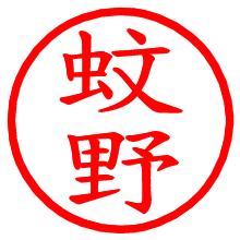 [朱肉の色]を選び、入力窓に“蚊野”と入力して[生成]ボタンを押すと、印影が更新され、リンクから電子印鑑(デジタル印影)がダウンロードできます。 電子印鑑「蚊野」の作り方文字表示が変なときや、文字バランスが悪いときは[字形切替]のチェックボックスでON/OFFを切り替え[生成]しなおしてください。 生成される画像は通常の印影「蚊野.png」と、にじみを表現した少し太めの印影「蚊野B.png」の背面透過PNG形式2種と、鮮明なPDF形式の印影「蚊野.pdf」の計3種類です。 朱肉の微妙な色の違いを7色で表現しました。デフォルト(左端)は、JISが定めた朱肉の色のマンセル値(7.5R 5/14)をRGB値(217,66,54)に変換したものになっています。 「電子透かし」にチェックを入れて[生成]ボタンを押すと、タイムスタンプを透かしとして埋め込んだセキュアな電子印鑑が作れます。詳細は別ページの「電子透かしとタイムスタンプ」でご覧ください。 蚊野さんの日付印が作れます。「日付スタンプメーカー」は、社内向けの書類に利用されることの多い日付印(データ印)が無料で作れるWebアプリケーションです。中段に日付が入り、上段と下段は、ともに8文字まで文字が入ります。 ![]() 古代文字で落款印が作れます。「落款スタンプメーカー」で作品を引き立たせる落款印が作れます。