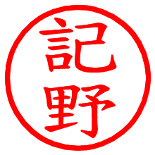 [朱肉の色]を選び、入力窓に“記野”と入力して[生成]ボタンを押すと、印影が更新され、リンクから電子印鑑(デジタル印影)がダウンロードできます。 電子印鑑「記野」の作り方文字表示が変なときや、文字バランスが悪いときは[字形切替]のチェックボックスでON/OFFを切り替え[生成]しなおしてください。 生成される画像は通常の印影「記野.png」と、にじみを表現した少し太めの印影「記野B.png」の背面透過PNG形式2種と、鮮明なPDF形式の印影「記野.pdf」の計3種類です。 朱肉の微妙な色の違いを7色で表現しました。デフォルト(左端)は、JISが定めた朱肉の色のマンセル値(7.5R 5/14)をRGB値(217,66,54)に変換したものになっています。 「電子透かし」にチェックを入れて[生成]ボタンを押すと、タイムスタンプを電子透かしとして埋め込んだセキュアな電子印鑑が作れます。詳細は別ページの「タイムスタンプと電子透かし」でご覧ください。 記野さんの日付印が作れます。「日付スタンプメーカー」は、社内向けの書類に利用されることの多い日付印(データ印)が無料で作れるWebアプリケーションです。中段に日付が入り、上段と下段は、ともに8文字まで文字が入ります。 ![]() 古代文字で落款印が作れます。「落款スタンプメーカー」で作品を引き立たせる落款印が作れます。