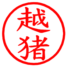 [朱肉の色]を選び、入力窓に“越猪”と入力して[生成]ボタンを押すと、印影が更新され、リンクから電子印鑑(デジタル印影)がダウンロードできます。 電子印鑑「越猪」の作り方文字表示が変なときや、文字バランスが悪いときは[字形切替]のチェックボックスでON/OFFを切り替え[生成]しなおしてください。 生成される画像は通常の印影「越猪.png」と、にじみを表現した少し太めの印影「越猪B.png」の背面透過PNG形式2種と、鮮明なPDF形式の印影「越猪.pdf」の計3種類です。 朱肉の微妙な色の違いを7色で表現しました。デフォルト(左端)は、JISが定めた朱肉の色のマンセル値(7.5R 5/14)をRGB値(217,66,54)に変換したものになっています。 「電子透かし」にチェックを入れて[生成]ボタンを押すと、タイムスタンプを透かしとして埋め込んだセキュアな電子印鑑が作れます。詳細は別ページの「電子透かしとタイムスタンプ」でご覧ください。 越猪さんの日付印が作れます。「日付スタンプメーカー」は、社内向けの書類に利用されることの多い日付印(データ印)が無料で作れるWebアプリケーションです。中段に日付が入り、上段と下段は、ともに8文字まで文字が入ります。 ![]() 古代文字で落款印が作れます。「落款スタンプメーカー」で作品を引き立たせる落款印が作れます。