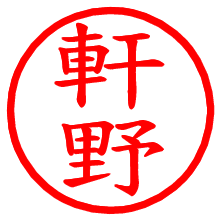 [朱肉の色]を選び、入力窓に“軒野”と入力して[生成]ボタンを押すと、印影が更新され、リンクから電子印鑑(デジタル印影)がダウンロードできます。 電子印鑑「軒野」の作り方文字表示が変なときや、文字バランスが悪いときは[字形切替]のチェックボックスでON/OFFを切り替え[生成]しなおしてください。 生成される画像は通常の印影「軒野.png」と、にじみを表現した少し太めの印影「軒野B.png」の背面透過PNG形式2種と、鮮明なPDF形式の印影「軒野.pdf」の計3種類です。 朱肉の微妙な色の違いを7色で表現しました。デフォルト(左端)は、JISが定めた朱肉の色のマンセル値(7.5R 5/14)をRGB値(217,66,54)に変換したものになっています。 「電子透かし」にチェックを入れて[生成]ボタンを押すと、タイムスタンプを電子透かしとして埋め込んだセキュアな電子印鑑が作れます。詳細は別ページの「タイムスタンプと電子透かし」でご覧ください。 軒野さんの日付印が作れます。「日付スタンプメーカー」は、社内向けの書類に利用されることの多い日付印(データ印)が無料で作れるWebアプリケーションです。中段に日付が入り、上段と下段は、ともに8文字まで文字が入ります。 ![]() 古代文字で落款印が作れます。「落款スタンプメーカー」で作品を引き立たせる落款印が作れます。