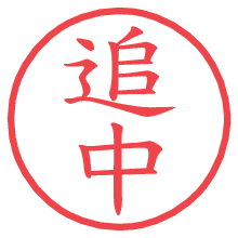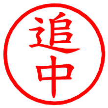 [朱肉の色]を選び、入力窓に“追中”と入力して[生成]ボタンを押すと、印影が更新され、リンクから電子印鑑(デジタル印影)がダウンロードできます。 電子印鑑「追中」の作り方文字表示が変なときや、文字バランスが悪いときは[字形切替]のチェックボックスでON/OFFを切り替え[生成]しなおしてください。 生成される画像は通常の印影「追中.png」と、にじみを表現した少し太めの印影「追中B.png」の背面透過PNG形式2種と、鮮明なPDF形式の印影「追中.pdf」の計3種類です。 朱肉の微妙な色の違いを7色で表現しました。デフォルト(左端)は、JISが定めた朱肉の色のマンセル値(7.5R 5/14)をRGB値(217,66,54)に変換したものになっています。 「電子透かし」にチェックを入れて[生成]ボタンを押すと、タイムスタンプを電子透かしとして埋め込んだセキュアな電子印鑑が作れます。詳細は別ページの「タイムスタンプと電子透かし」でご覧ください。 追中さんの日付印が作れます。「日付スタンプメーカー」は、社内向けの書類に利用されることの多い日付印(データ印)が無料で作れるWebアプリケーションです。中段に日付が入り、上段と下段は、ともに8文字まで文字が入ります。 ![]() 古代文字で落款印が作れます。「落款スタンプメーカー」で作品を引き立たせる落款印が作れます。
