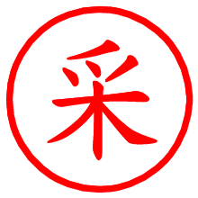 [朱肉の色]を選び、入力窓に“采”と入力して[生成]ボタンを押すと、印影が更新され、リンクから電子印鑑(デジタル印影)がダウンロードできます。 電子印鑑「采」の作り方文字表示が変なときや、文字バランスが悪いときは[字形切替]のチェックボックスでON/OFFを切り替え[生成]しなおしてください。 生成される画像は通常の印影「采.png」と、にじみを表現した少し太めの印影「采B.png」の背面透過PNG形式2種と、鮮明なPDF形式の印影「采.pdf」の計3種類です。 朱肉の微妙な色の違いを7色で表現しました。デフォルト(左端)は、JISが定めた朱肉の色のマンセル値(7.5R 5/14)をRGB値(217,66,54)に変換したものになっています。 「電子透かし」にチェックを入れて[生成]ボタンを押すと、タイムスタンプを電子透かしとして埋め込んだセキュアな電子印鑑が作れます。詳細は別ページの「タイムスタンプと電子透かし」でご覧ください。 采さんの日付印が作れます。「日付スタンプメーカー」は、社内向けの書類に利用されることの多い日付印(データ印)が無料で作れるWebアプリケーションです。中段に日付が入り、上段と下段は、ともに8文字まで文字が入ります。 ![]() 古代文字で落款印が作れます。「落款スタンプメーカー」で作品を引き立たせる落款印が作れます。