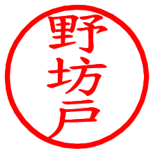 [朱肉の色]を選び、入力窓に“野坊戸”と入力して[生成]ボタンを押すと、印影が更新され、リンクから電子印鑑(デジタル印影)がダウンロードできます。 電子印鑑「野坊戸」の作り方文字表示が変なときや、文字バランスが悪いときは[字形切替]のチェックボックスでON/OFFを切り替え[生成]しなおしてください。 生成される画像は通常の印影「野坊戸.png」と、にじみを表現した少し太めの印影「野坊戸B.png」の背面透過PNG形式2種と、鮮明なPDF形式の印影「野坊戸.pdf」の計3種類です。 朱肉の微妙な色の違いを7色で表現しました。デフォルト(左端)は、JISが定めた朱肉の色のマンセル値(7.5R 5/14)をRGB値(217,66,54)に変換したものになっています。 「電子透かし」にチェックを入れて[生成]ボタンを押すと、タイムスタンプを電子透かしとして埋め込んだセキュアな電子印鑑が作れます。詳細は別ページの「タイムスタンプと電子透かし」でご覧ください。 野坊戸さんの日付印が作れます。「日付スタンプメーカー」は、社内向けの書類に利用されることの多い日付印(データ印)が無料で作れるWebアプリケーションです。中段に日付が入り、上段と下段は、ともに8文字まで文字が入ります。 ![]() 古代文字で落款印が作れます。「落款スタンプメーカー」で作品を引き立たせる落款印が作れます。