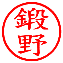 [朱肉の色]を選び、入力窓に“鍛野”と入力して[生成]ボタンを押すと、印影が更新され、リンクから電子印鑑(デジタル印影)がダウンロードできます。 電子印鑑「鍛野」の作り方文字表示が変なときや、文字バランスが悪いときは[字形切替]のチェックボックスでON/OFFを切り替え[生成]しなおしてください。 生成される画像は通常の印影「鍛野.png」と、にじみを表現した少し太めの印影「鍛野B.png」の背面透過PNG形式2種と、鮮明なPDF形式の印影「鍛野.pdf」の計3種類です。 朱肉の微妙な色の違いを7色で表現しました。デフォルト(左端)は、JISが定めた朱肉の色のマンセル値(7.5R 5/14)をRGB値(217,66,54)に変換したものになっています。 「電子透かし」にチェックを入れて[生成]ボタンを押すと、タイムスタンプを電子透かしとして埋め込んだセキュアな電子印鑑が作れます。詳細は別ページの「タイムスタンプと電子透かし」でご覧ください。 鍛野さんの日付印が作れます。「日付スタンプメーカー」は、社内向けの書類に利用されることの多い日付印(データ印)が無料で作れるWebアプリケーションです。中段に日付が入り、上段と下段は、ともに8文字まで文字が入ります。 ![]() 古代文字で落款印が作れます。「落款スタンプメーカー」で作品を引き立たせる落款印が作れます。