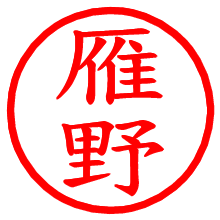 [朱肉の色]を選び、入力窓に“雁野”と入力して[生成]ボタンを押すと、印影が更新され、リンクから電子印鑑(デジタル印影)がダウンロードできます。 電子印鑑「雁野」の作り方文字表示が変なときや、文字バランスが悪いときは[字形切替]のチェックボックスでON/OFFを切り替え[生成]しなおしてください。 生成される画像は通常の印影「雁野.png」と、にじみを表現した少し太めの印影「雁野B.png」の背面透過PNG形式2種と、鮮明なPDF形式の印影「雁野.pdf」の計3種類です。 朱肉の微妙な色の違いを7色で表現しました。デフォルト(左端)は、JISが定めた朱肉の色のマンセル値(7.5R 5/14)をRGB値(217,66,54)に変換したものになっています。 「電子透かし」にチェックを入れて[生成]ボタンを押すと、タイムスタンプを電子透かしとして埋め込んだセキュアな電子印鑑が作れます。詳細は別ページの「タイムスタンプと電子透かし」でご覧ください。 雁野さんの日付印が作れます。「日付スタンプメーカー」は、社内向けの書類に利用されることの多い日付印(データ印)が無料で作れるWebアプリケーションです。中段に日付が入り、上段と下段は、ともに8文字まで文字が入ります。 ![]() 古代文字で落款印が作れます。「落款スタンプメーカー」で作品を引き立たせる落款印が作れます。