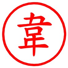 [朱肉の色]を選び、入力窓に“韋”と入力して[生成]ボタンを押すと、印影が更新され、リンクから電子印鑑(デジタル印影)がダウンロードできます。 電子印鑑「韋」の作り方文字表示が変なときや、文字バランスが悪いときは[字形切替]のチェックボックスでON/OFFを切り替え[生成]しなおしてください。 生成される画像は通常の印影「韋.png」と、にじみを表現した少し太めの印影「韋B.png」の背面透過PNG形式2種と、鮮明なPDF形式の印影「韋.pdf」の計3種類です。 朱肉の微妙な色の違いを7色で表現しました。デフォルト(左端)は、JISが定めた朱肉の色のマンセル値(7.5R 5/14)をRGB値(217,66,54)に変換したものになっています。 「電子透かし」にチェックを入れて[生成]ボタンを押すと、タイムスタンプを電子透かしとして埋め込んだセキュアな電子印鑑が作れます。詳細は別ページの「タイムスタンプと電子透かし」でご覧ください。 韋さんの日付印が作れます。「日付スタンプメーカー」は、社内向けの書類に利用されることの多い日付印(データ印)が無料で作れるWebアプリケーションです。中段に日付が入り、上段と下段は、ともに8文字まで文字が入ります。 ![]() 古代文字で落款印が作れます。「落款スタンプメーカー」で作品を引き立たせる落款印が作れます。