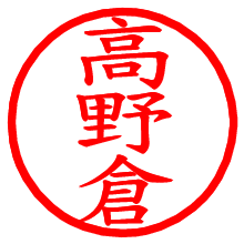 [朱肉の色]を選び、入力窓に“高野倉”と入力して[生成]ボタンを押すと、印影が更新され、リンクから電子印鑑(デジタル印影)がダウンロードできます。 電子印鑑「高野倉」の作り方文字表示が変なときや、文字バランスが悪いときは[字形切替]のチェックボックスでON/OFFを切り替え[生成]しなおしてください。 生成される画像は通常の印影「高野倉.png」と、にじみを表現した少し太めの印影「高野倉B.png」の背面透過PNG形式2種と、鮮明なPDF形式の印影「高野倉.pdf」の計3種類です。 朱肉の微妙な色の違いを7色で表現しました。デフォルト(左端)は、JISが定めた朱肉の色のマンセル値(7.5R 5/14)をRGB値(217,66,54)に変換したものになっています。 「電子透かし」にチェックを入れて[生成]ボタンを押すと、タイムスタンプを透かしとして埋め込んだセキュアな電子印鑑が作れます。詳細は別ページの「電子透かしとタイムスタンプ」でご覧ください。 高野倉さんの日付印が作れます。「日付スタンプメーカー」は、社内向けの書類に利用されることの多い日付印(データ印)が無料で作れるWebアプリケーションです。中段に日付が入り、上段と下段は、ともに8文字まで文字が入ります。 ![]() 古代文字で落款印が作れます。「落款スタンプメーカー」で作品を引き立たせる落款印が作れます。
