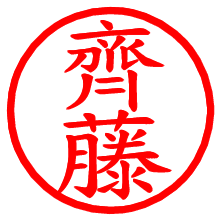 [朱肉の色]を選び、入力窓に“齊藤”と入力して[生成]ボタンを押すと、印影が更新され、リンクから電子印鑑(デジタル印影)がダウンロードできます。 電子印鑑「齊藤」の作り方文字表示が変なときや、文字バランスが悪いときは[字形切替]のチェックボックスでON/OFFを切り替え[生成]しなおしてください。 生成される画像は通常の印影「齊藤.png」と、にじみを表現した少し太めの印影「齊藤B.png」の背面透過PNG形式2種と、鮮明なPDF形式の印影「齊藤.pdf」の計3種類です。 朱肉の微妙な色の違いを7色で表現しました。デフォルト(左端)は、JISが定めた朱肉の色のマンセル値(7.5R 5/14)をRGB値(217,66,54)に変換したものになっています。 「電子透かし」にチェックを入れて[生成]ボタンを押すと、タイムスタンプを透かしとして埋め込んだセキュアな電子印鑑が作れます。詳細は別ページの「電子透かしとタイムスタンプ」でご覧ください。 齊藤さんの日付印が作れます。「日付スタンプメーカー」は、社内向けの書類に利用されることの多い日付印(データ印)が無料で作れるWebアプリケーションです。中段に日付が入り、上段と下段は、ともに8文字まで文字が入ります。 ![]() 古代文字で落款印が作れます。「落款スタンプメーカー」で作品を引き立たせる落款印が作れます。