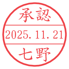 オプションの「電子透かし」をチェックし[生成]すると、見た目には分からないように、UNIXタイムスタンプを識別情報としてPNG形式の日付印に埋め込みます。 日付スタンプメーカーの使い方「部署」「名前」は最大8文字まで入力が可能です。「スタンプの色」を選択し、[生成]ボタン押下で印影画像が更新され、背景を透明に設定したPNG形式とPDF形式の印影画像がリンクからダウンロードできます。 オプションの「電子透かし」は、その性格上日付印ととても相性の良い付加サービスです。 別ページの「タイムスタンプと電子透かし」でも詳しく解説しますが、このオプションを追加することで、日付印が生成された日時に確かにその印が存在していることが証明されます。 ![]() 七野さんの電子印鑑が作れます。社内でのデータ書類閲覧確認用など、認印的な使い方のできる電子印鑑が作れます。 ![]() 古代文字で落款印が作れます。「落款スタンプメーカー」で作品を引き立たせる落款印が作れます。