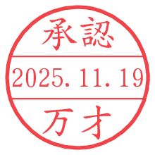 オプションの「電子透かし」をチェックし[生成]すると、見た目には分からないように、UNIXタイムスタンプを識別情報としてPNG形式の日付印に埋め込みます。 日付スタンプメーカーの使い方「部署」「名前」は最大8文字まで入力が可能です。「スタンプの色」を選択し、[生成]ボタン押下で印影画像が更新され、背景を透明に設定したPNG形式とPDF形式の印影画像がリンクからダウンロードできます。 オプションの「電子透かし」は、その性格上日付印ととても相性の良い付加サービスです。 別ページの「タイムスタンプと電子透かし」でも詳しく解説しますが、このオプションを追加することで、日付印が生成された日時に確かにその印が存在していることが証明されます。 ![]() 万才さんの電子印鑑が作れます。社内でのデータ書類閲覧確認用など、認印的な使い方のできる電子印鑑が作れます。 ![]() 古代文字で落款印が作れます。「落款スタンプメーカー」で作品を引き立たせる落款印が作れます。