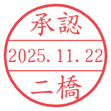 オプションの「電子透かし」をチェックし[生成]すると、見た目には分からないように、UNIXタイムスタンプを識別情報としてPNG形式の日付印に埋め込みます。 日付スタンプメーカーの使い方「部署」「名前」は最大8文字まで入力が可能です。「スタンプの色」を選択し、[生成]ボタン押下で印影画像が更新され、背景を透明に設定したPNG形式とPDF形式の印影画像がリンクからダウンロードできます。 オプションの「電子透かし」は、その性格上日付印ととても相性の良い付加サービスです。 別ページの「タイムスタンプと電子透かし」でも詳しく解説しますが、このオプションを追加することで、日付印が生成された日時に確かにその印が存在していることが証明されます。 ![]() 二橋さんの電子印鑑が作れます。社内でのデータ書類閲覧確認用など、認印的な使い方のできる電子印鑑が作れます。 ![]() 古代文字で落款印が作れます。「落款スタンプメーカー」で作品を引き立たせる落款印が作れます。