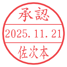オプションの「電子透かし」をチェックし[生成]すると、見た目には分からないように、UNIXタイムスタンプを識別情報としてPNG形式の日付印に埋め込みます。 日付スタンプメーカーの使い方「部署」「名前」は最大8文字まで入力が可能です。「スタンプの色」を選択し、[生成]ボタン押下で印影画像が更新され、背景を透明に設定したPNG形式とPDF形式の印影画像がリンクからダウンロードできます。 オプションの「電子透かし」は、その性格上日付印ととても相性の良い付加サービスです。 別ページの「タイムスタンプと電子透かし」でも詳しく解説しますが、このオプションを追加することで、日付印が生成された日時に確かにその印が存在していることが証明されます。 ![]() 佐次本さんの電子印鑑が作れます。社内でのデータ書類閲覧確認用など、認印的な使い方のできる電子印鑑が作れます。 ![]() 古代文字で落款印が作れます。「落款スタンプメーカー」で作品を引き立たせる落款印が作れます。