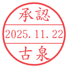 オプションの「電子透かし」をチェックし[生成]すると、見た目には分からないように、UNIXタイムスタンプを識別情報としてPNG形式の日付印に埋め込みます。 日付スタンプメーカーの使い方「部署」「名前」は最大8文字まで入力が可能です。「スタンプの色」を選択し、[生成]ボタン押下で印影画像が更新され、背景を透明に設定したPNG形式とPDF形式の印影画像がリンクからダウンロードできます。 オプションの「電子透かし」は、その性格上日付印ととても相性の良い付加サービスです。 別ページの「タイムスタンプと電子透かし」でも詳しく解説しますが、このオプションを追加することで、日付印が生成された日時に確かにその印が存在していることが証明されます。 ![]() 古泉さんの電子印鑑が作れます。社内でのデータ書類閲覧確認用など、認印的な使い方のできる電子印鑑が作れます。 ![]() 古代文字で落款印が作れます。「落款スタンプメーカー」で作品を引き立たせる落款印が作れます。
