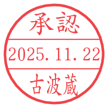 オプションの「電子透かし」をチェックし[生成]すると、見た目には分からないように、UNIXタイムスタンプを識別情報としてPNG形式の日付印に埋め込みます。 日付スタンプメーカーの使い方「部署」「名前」は最大8文字まで入力が可能です。「スタンプの色」を選択し、[生成]ボタン押下で印影画像が更新され、背景を透明に設定したPNG形式とPDF形式の印影画像がリンクからダウンロードできます。 オプションの「電子透かし」は、その性格上日付印ととても相性の良い付加サービスです。 別ページの「タイムスタンプと電子透かし」でも詳しく解説しますが、このオプションを追加することで、日付印が生成された日時に確かにその印が存在していることが証明されます。 ![]() 古波蔵さんの電子印鑑が作れます。社内でのデータ書類閲覧確認用など、認印的な使い方のできる電子印鑑が作れます。 ![]() 古代文字で落款印が作れます。「落款スタンプメーカー」で作品を引き立たせる落款印が作れます。