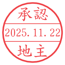 オプションの「電子透かし」をチェックし[生成]すると、見た目には分からないように、UNIXタイムスタンプを識別情報としてPNG形式の日付印に埋め込みます。 日付スタンプメーカーの使い方「部署」「名前」は最大8文字まで入力が可能です。「スタンプの色」を選択し、[生成]ボタン押下で印影画像が更新され、背景を透明に設定したPNG形式とPDF形式の印影画像がリンクからダウンロードできます。 オプションの「電子透かし」は、その性格上日付印ととても相性の良い付加サービスです。 別ページの「タイムスタンプと電子透かし」でも詳しく解説しますが、このオプションを追加することで、日付印が生成された日時に確かにその印が存在していることが証明されます。 ![]() 地主さんの電子印鑑が作れます。社内でのデータ書類閲覧確認用など、認印的な使い方のできる電子印鑑が作れます。 ![]() 古代文字で落款印が作れます。「落款スタンプメーカー」で作品を引き立たせる落款印が作れます。