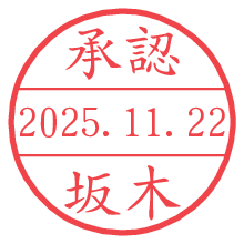 オプションの「電子透かし」をチェックし[生成]すると、見た目には分からないように、UNIXタイムスタンプを識別情報としてPNG形式の日付印に埋め込みます。 日付スタンプメーカーの使い方「部署」「名前」は最大8文字まで入力が可能です。「スタンプの色」を選択し、[生成]ボタン押下で印影画像が更新され、背景を透明に設定したPNG形式とPDF形式の印影画像がリンクからダウンロードできます。 オプションの「電子透かし」は、その性格上日付印ととても相性の良い付加サービスです。 別ページの「タイムスタンプと電子透かし」でも詳しく解説しますが、このオプションを追加することで、日付印が生成された日時に確かにその印が存在していることが証明されます。 ![]() 坂木さんの電子印鑑が作れます。社内でのデータ書類閲覧確認用など、認印的な使い方のできる電子印鑑が作れます。 ![]() 古代文字で落款印が作れます。「落款スタンプメーカー」で作品を引き立たせる落款印が作れます。