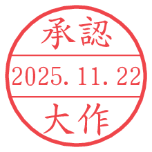 オプションの「電子透かし」をチェックし[生成]すると、見た目には分からないように、UNIXタイムスタンプを識別情報としてPNG形式の日付印に埋め込みます。 日付スタンプメーカーの使い方「部署」「名前」は最大8文字まで入力が可能です。「スタンプの色」を選択し、[生成]ボタン押下で印影画像が更新され、背景を透明に設定したPNG形式とPDF形式の印影画像がリンクからダウンロードできます。 オプションの「電子透かし」は、その性格上日付印ととても相性の良い付加サービスです。 別ページの「タイムスタンプと電子透かし」でも詳しく解説しますが、このオプションを追加することで、日付印が生成された日時に確かにその印が存在していることが証明されます。 ![]() 大作さんの電子印鑑が作れます。社内でのデータ書類閲覧確認用など、認印的な使い方のできる電子印鑑が作れます。 ![]() 古代文字で落款印が作れます。「落款スタンプメーカー」で作品を引き立たせる落款印が作れます。