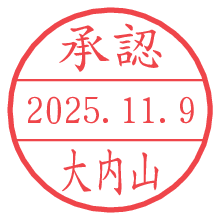 オプションの「電子透かし」をチェックし[生成]すると、見た目には分からないように、UNIXタイムスタンプを識別情報としてPNG形式の日付印に埋め込みます。 日付スタンプメーカーの使い方「部署」「名前」は最大8文字まで入力が可能です。「スタンプの色」を選択し、[生成]ボタン押下で印影画像が更新され、背景を透明に設定したPNG形式とPDF形式の印影画像がリンクからダウンロードできます。 オプションの「電子透かし」は、その性格上日付印ととても相性の良い付加サービスです。 別ページの「タイムスタンプと電子透かし」でも詳しく解説しますが、このオプションを追加することで、日付印が生成された日時に確かにその印が存在していることが証明されます。 ![]() 大内山さんの電子印鑑が作れます。社内でのデータ書類閲覧確認用など、認印的な使い方のできる電子印鑑が作れます。 ![]() 古代文字で落款印が作れます。「落款スタンプメーカー」で作品を引き立たせる落款印が作れます。