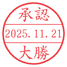 オプションの「電子透かし」をチェックし[生成]すると、見た目には分からないように、UNIXタイムスタンプを識別情報としてPNG形式の日付印に埋め込みます。 日付スタンプメーカーの使い方「部署」「名前」は最大8文字まで入力が可能です。「スタンプの色」を選択し、[生成]ボタン押下で印影画像が更新され、背景を透明に設定したPNG形式とPDF形式の印影画像がリンクからダウンロードできます。 オプションの「電子透かし」は、その性格上日付印ととても相性の良い付加サービスです。 別ページの「タイムスタンプと電子透かし」でも詳しく解説しますが、このオプションを追加することで、日付印が生成された日時に確かにその印が存在していることが証明されます。 ![]() 大勝さんの電子印鑑が作れます。社内でのデータ書類閲覧確認用など、認印的な使い方のできる電子印鑑が作れます。 ![]() 古代文字で落款印が作れます。「落款スタンプメーカー」で作品を引き立たせる落款印が作れます。