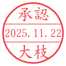 オプションの「電子透かし」をチェックし[生成]すると、見た目には分からないように、UNIXタイムスタンプを識別情報としてPNG形式の日付印に埋め込みます。 日付スタンプメーカーの使い方「部署」「名前」は最大8文字まで入力が可能です。「スタンプの色」を選択し、[生成]ボタン押下で印影画像が更新され、背景を透明に設定したPNG形式とPDF形式の印影画像がリンクからダウンロードできます。 オプションの「電子透かし」は、その性格上日付印ととても相性の良い付加サービスです。 別ページの「タイムスタンプと電子透かし」でも詳しく解説しますが、このオプションを追加することで、日付印が生成された日時に確かにその印が存在していることが証明されます。 ![]() 大枝さんの電子印鑑が作れます。社内でのデータ書類閲覧確認用など、認印的な使い方のできる電子印鑑が作れます。 ![]() 古代文字で落款印が作れます。「落款スタンプメーカー」で作品を引き立たせる落款印が作れます。