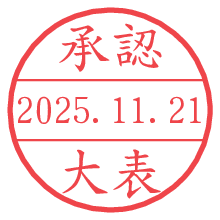 オプションの「電子透かし」をチェックし[生成]すると、見た目には分からないように、UNIXタイムスタンプを識別情報としてPNG形式の日付印に埋め込みます。 日付スタンプメーカーの使い方「部署」「名前」は最大8文字まで入力が可能です。「スタンプの色」を選択し、[生成]ボタン押下で印影画像が更新され、背景を透明に設定したPNG形式とPDF形式の印影画像がリンクからダウンロードできます。 オプションの「電子透かし」は、その性格上日付印ととても相性の良い付加サービスです。 別ページの「タイムスタンプと電子透かし」でも詳しく解説しますが、このオプションを追加することで、日付印が生成された日時に確かにその印が存在していることが証明されます。 ![]() 大表さんの電子印鑑が作れます。社内でのデータ書類閲覧確認用など、認印的な使い方のできる電子印鑑が作れます。 ![]() 古代文字で落款印が作れます。「落款スタンプメーカー」で作品を引き立たせる落款印が作れます。
