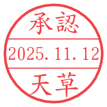 オプションの「電子透かし」をチェックし[生成]すると、見た目には分からないように、UNIXタイムスタンプを識別情報としてPNG形式の日付印に埋め込みます。 日付スタンプメーカーの使い方「部署」「名前」は最大8文字まで入力が可能です。「スタンプの色」を選択し、[生成]ボタン押下で印影画像が更新され、背景を透明に設定したPNG形式とPDF形式の印影画像がリンクからダウンロードできます。 オプションの「電子透かし」は、その性格上日付印ととても相性の良い付加サービスです。 別ページの「タイムスタンプと電子透かし」でも詳しく解説しますが、このオプションを追加することで、日付印が生成された日時に確かにその印が存在していることが証明されます。 ![]() 天草さんの電子印鑑が作れます。社内でのデータ書類閲覧確認用など、認印的な使い方のできる電子印鑑が作れます。 ![]() 古代文字で落款印が作れます。「落款スタンプメーカー」で作品を引き立たせる落款印が作れます。