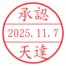 オプションの「電子透かし」をチェックし[生成]すると、見た目には分からないように、UNIXタイムスタンプを識別情報としてPNG形式の日付印に埋め込みます。 日付スタンプメーカーの使い方「部署」「名前」は最大8文字まで入力が可能です。「スタンプの色」を選択し、[生成]ボタン押下で印影画像が更新され、背景を透明に設定したPNG形式とPDF形式の印影画像がリンクからダウンロードできます。 オプションの「電子透かし」は、その性格上日付印ととても相性の良い付加サービスです。 別ページの「タイムスタンプと電子透かし」でも詳しく解説しますが、このオプションを追加することで、日付印が生成された日時に確かにその印が存在していることが証明されます。 ![]() 天達さんの電子印鑑が作れます。社内でのデータ書類閲覧確認用など、認印的な使い方のできる電子印鑑が作れます。 ![]() 古代文字で落款印が作れます。「落款スタンプメーカー」で作品を引き立たせる落款印が作れます。