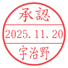 オプションの「電子透かし」をチェックし[生成]すると、見た目には分からないように、UNIXタイムスタンプを識別情報としてPNG形式の日付印に埋め込みます。 日付スタンプメーカーの使い方「部署」「名前」は最大8文字まで入力が可能です。「スタンプの色」を選択し、[生成]ボタン押下で印影画像が更新され、背景を透明に設定したPNG形式とPDF形式の印影画像がリンクからダウンロードできます。 オプションの「電子透かし」は、その性格上日付印ととても相性の良い付加サービスです。 別ページの「タイムスタンプと電子透かし」でも詳しく解説しますが、このオプションを追加することで、日付印が生成された日時に確かにその印が存在していることが証明されます。 ![]() 宇治野さんの電子印鑑が作れます。社内でのデータ書類閲覧確認用など、認印的な使い方のできる電子印鑑が作れます。 ![]() 古代文字で落款印が作れます。「落款スタンプメーカー」で作品を引き立たせる落款印が作れます。