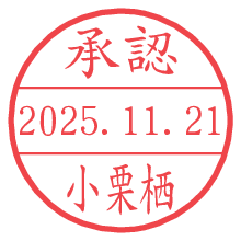 オプションの「電子透かし」をチェックし[生成]すると、見た目には分からないように、UNIXタイムスタンプを識別情報としてPNG形式の日付印に埋め込みます。 日付スタンプメーカーの使い方「部署」「名前」は最大8文字まで入力が可能です。「スタンプの色」を選択し、[生成]ボタン押下で印影画像が更新され、背景を透明に設定したPNG形式とPDF形式の印影画像がリンクからダウンロードできます。 オプションの「電子透かし」は、その性格上日付印ととても相性の良い付加サービスです。 別ページの「タイムスタンプと電子透かし」でも詳しく解説しますが、このオプションを追加することで、日付印が生成された日時に確かにその印が存在していることが証明されます。 ![]() 小栗栖さんの電子印鑑が作れます。社内でのデータ書類閲覧確認用など、認印的な使い方のできる電子印鑑が作れます。 ![]() 古代文字で落款印が作れます。「落款スタンプメーカー」で作品を引き立たせる落款印が作れます。