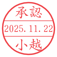 オプションの「電子透かし」をチェックし[生成]すると、見た目には分からないように、UNIXタイムスタンプを識別情報としてPNG形式の日付印に埋め込みます。 日付スタンプメーカーの使い方「部署」「名前」は最大8文字まで入力が可能です。「スタンプの色」を選択し、[生成]ボタン押下で印影画像が更新され、背景を透明に設定したPNG形式とPDF形式の印影画像がリンクからダウンロードできます。 オプションの「電子透かし」は、その性格上日付印ととても相性の良い付加サービスです。 別ページの「タイムスタンプと電子透かし」でも詳しく解説しますが、このオプションを追加することで、日付印が生成された日時に確かにその印が存在していることが証明されます。 ![]() 小越さんの電子印鑑が作れます。社内でのデータ書類閲覧確認用など、認印的な使い方のできる電子印鑑が作れます。 ![]() 古代文字で落款印が作れます。「落款スタンプメーカー」で作品を引き立たせる落款印が作れます。